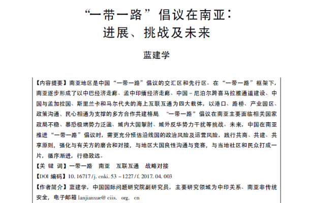 摘要:南亚地区是中国“一带一路”倡议的交汇区和先行区。在“一带一路”框架下,南亚逐步形成了以中巴经济走廊、孟中印缅经济走廊、中国- 尼泊尔跨喜马拉雅通道建设、中国与孟加拉国、斯里兰卡和马尔代夫的海上互联互通为四大载体,以港口、路桥、产业园区、政策沟通、民心相通为支撑的多方合作共建格局。
