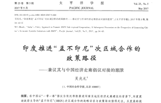 摘要:在中国以‘‘一带一路”倡议为依托积极推进同南亚地区经济走廊建设的背景下,印度莫迪政府主导的“孟不印尼”(BBIN)次区域合作的战略诉求与政策取向值得关注。从发展的视角看,作为追求地区影响力的工具,印度的目标并不限于“孟不印尼”,地区内形成“BBIN+2”,跨地区以BBIN为纽带有选择地强化与其他倡议对接,将是印度未来的政策方向。地理上的接壤成为中国推动参与南亚次区域合作的重要动力,然而地缘政治因素也深刻影响着中国倡议与“孟不印尼’’次区域合作对接的前景。为推动中国与南亚次区域合作的有效对接,需要在合作理念和参与途径等多个层面加以规划。