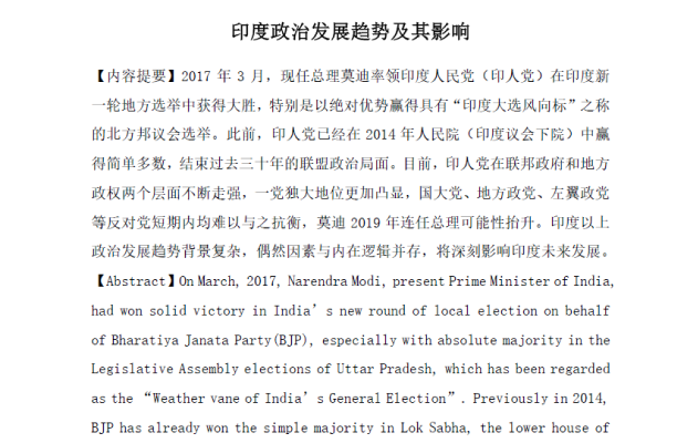 摘要:2017年3月,现任总理莫迪率领印度人民党(印人党)在印度新一轮地方选举中获得大胜,特别是以绝对优势赢得具有“印度大选风向标”之称的北方邦议会选举。此前,印人党已经在2014年人民院(印度议会下院)中赢得简单多数,结束过去三十年的联盟政治局面。目前,印人党在联邦政府和地方政权两个层面不断走强,一党独大地位更加凸显,国大党、地方政党、左翼政党等反对党短期内均难以与之抗衡,莫迪2019年连任总理可能性抬升。印度以上政治发展趋势背景复杂,偶然因素与内在逻辑并存,将深刻影响印度未来发展。